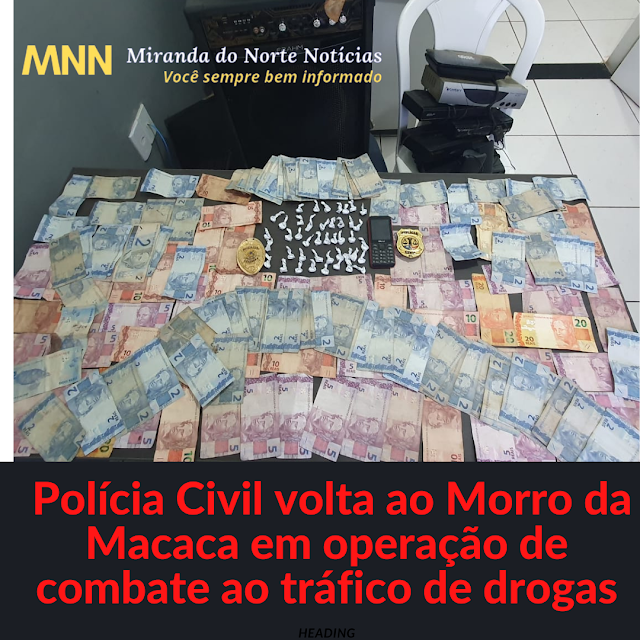 Em nova operação de repressão ao tráfico no Morro da Macaca, em Miranda do Norte, Polícia Civil prende homem em flagrante pelos crimes de tráfico de drogas e receptação dolosa, apreende drogas e dinheiro em espécie.